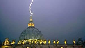 Lightning strikes the roof of St. Peter's Basilica at the Vatican on Feb. 11, 2013, hours after Pope Benedict XVI announced his resignation, effective on Feb. 28,2013.